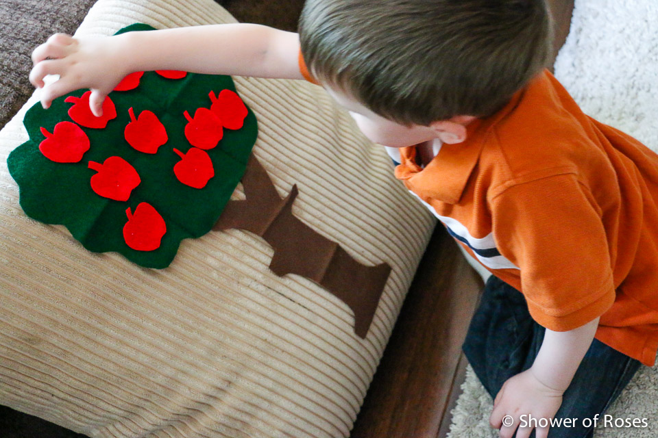 I tossed our old, homemade and very well-loved flannel board a couple years ago so we used one of the couch pillows instead... The apples were great for practicing his number sentences for "some, some more" and "some, some went away" stories.