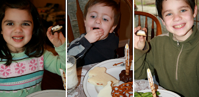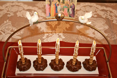 I made a little change to our Edible Candles this year. Instead of using Ginger Thins and Shortbread Cookies, I used just one Nabisco Pinwheel. These worked great as candleholders and I didn't have to worry about securing the "candle" with icing so it wouldn't fall over. :)