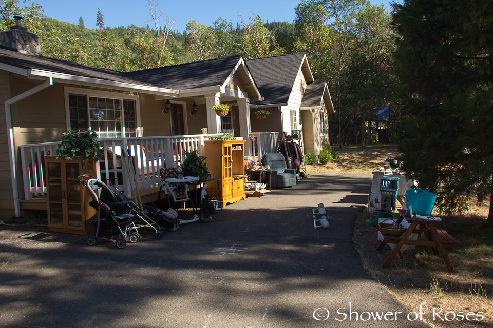 I decided to have a two day sale and set up everything out front on Thursday. Sean had to work both Friday and Saturday but was able to put up (and take down) the signs all along our road on his way to and from work.