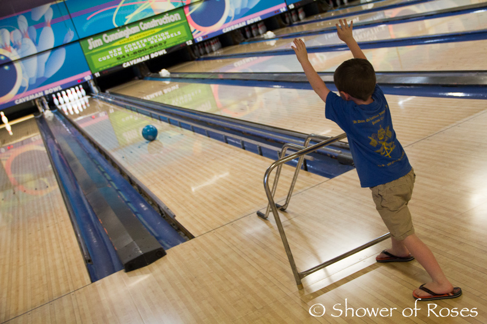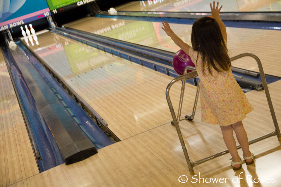 During the girls sewing class last week I took the rest of the children bowling! The boys had won four free games during golf camp this year and the nice gentleman behind the counter let Rose bowl for free as well!