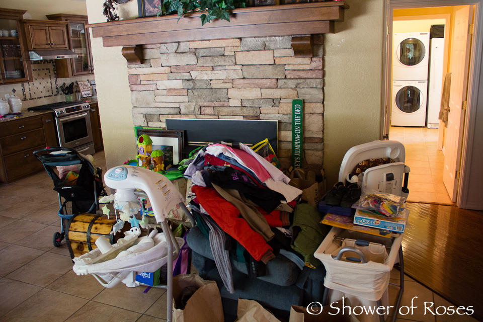 I tend to make a huge mess when I "organize." This is what my living room/entry looked like early last week as I started piling up everything to sell.