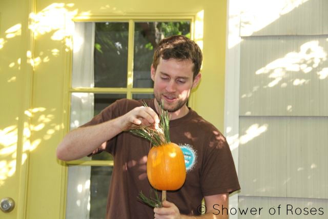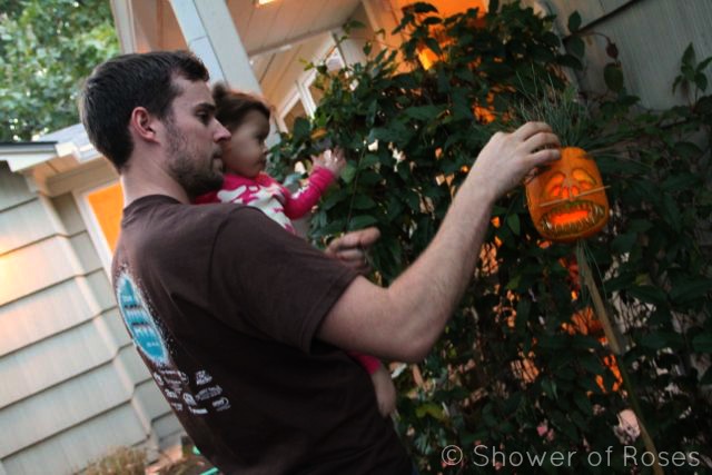 While we were working on our Saint-O-Lanterns my brother cracked me up with his "Pumpkin Head Tiki Torch!" While the tiki torch pumpkin was totally creepy, I loved his carving of a candle for his daughter! I'll be back to post pictures of our completed carvings later.