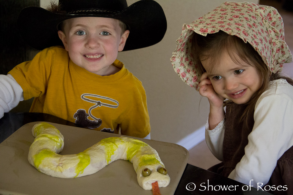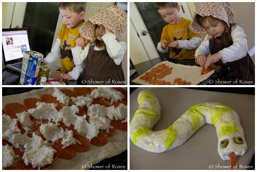 Shortcake had suggested incorporating a snake into our party, and Charlotte found me a recipe from Kraft for a Snake-Bite Calzone! Of course I needed "a five year old boy and a three year old girl" to help make a special lunch for the birthday girl! ;) The prefect distraction for my two "helpers" while the girls finished painting their memory boxes!