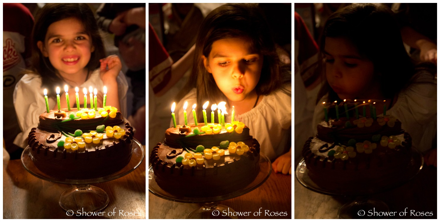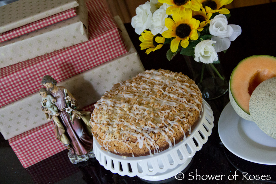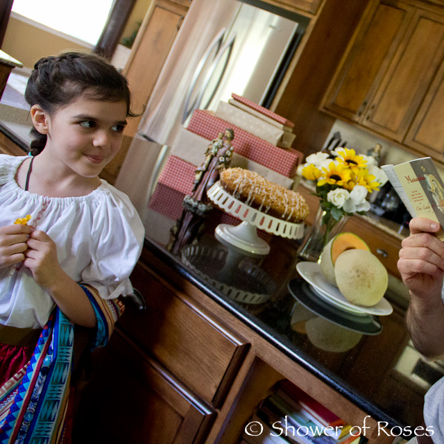 Usually I try to have a cake baked and decorated the night before, for the children to discover when they wake up in the morning, but Friday night Sean and I were out late (He had choir practice for our Latin Mass and I needed to run a few errands. Afterwards we went to every store in town trying to find a bike for the birthday girl.) so early Saturday morning we got up early, wrapped a few gifts, placed some flowers on the counter, along with a coffee cake and melon for breakfast. We then "woke up" the birthday girl singing Las Mañanitas! I purchased a beautiful Mañanitas CD from Sister Servants which we played all morning.