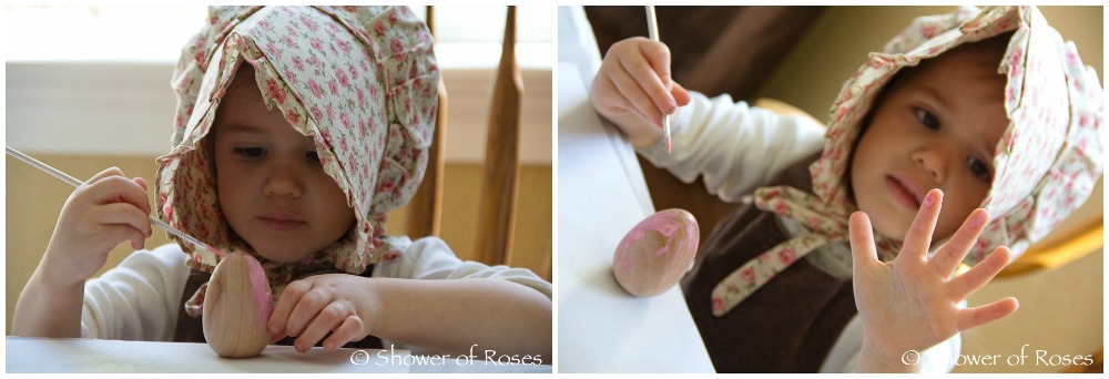 Rose didn't want to be left out of the painting fun... I ended up finding a wooden egg for her to paint. She painted it pink, of course, and has been carrying it around ever since!