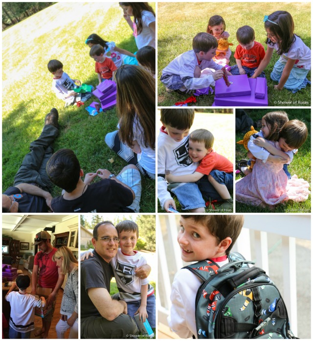 His birthday gifts included some little gifts from his siblings (I especially loved watching him open the bag of coins from his little sister. She was so excited to give them to him! And of course all the thank you hugs!), a water gun from Grandpa and Grandma, a fun airplane card and gift from his other grandparents, lots of little toys from Uncle Brian and Aunt Megan including this fun