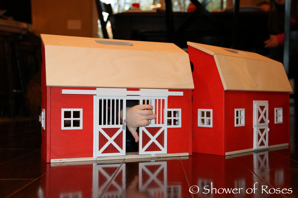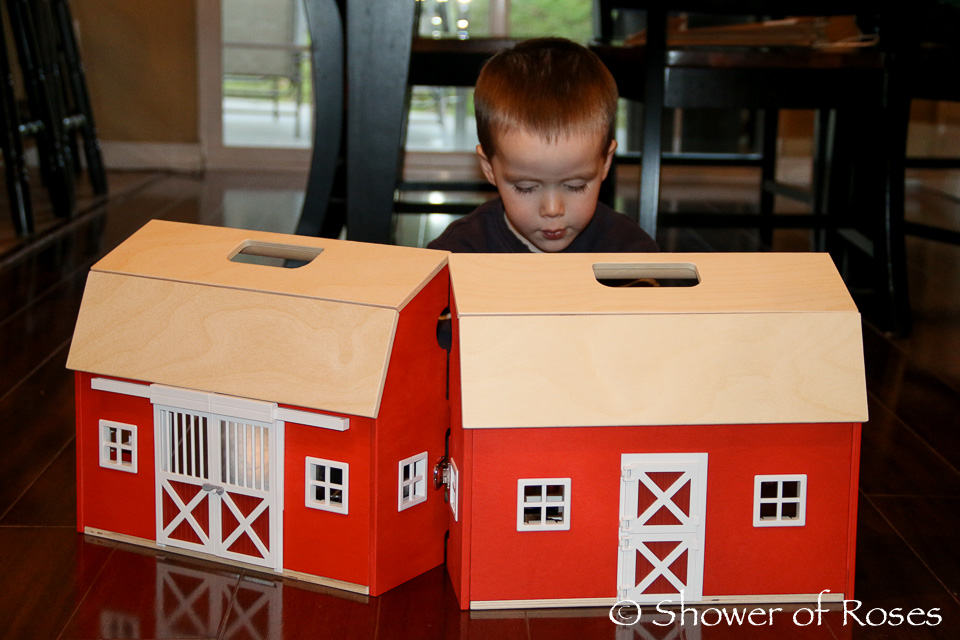 I had such a difficult time deciding on a wooden barn to purchase for Bud and ultimately ended up choosing the Schleich Portable Barn with Accessories. It's perfect!