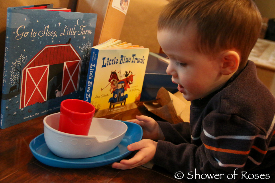 I happened to discover this darling little Tug Bowl Dinner Set during one of our trips to the coast last summer… I didn't purchase it at the time and was so excited to later find it on Amazon. It has been such a hit and he still uses it every day!