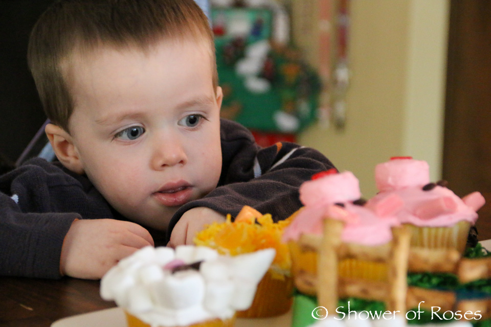 Bud loved ALL the animals on his cake, but when it came down to choosing which one he wanted he picked the sheep. How could he resist with all those "marmowwoahs!" Of course, he had to use his new Tug Boat plate too. :)