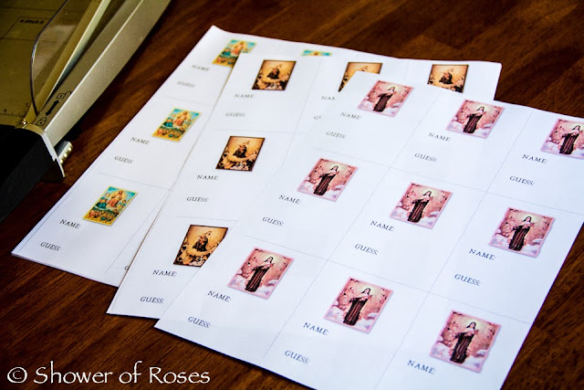 Like last time, I have printed 16 saint cards which I will hand out to 16 of the adults. The children will each receive the list of clues, and they will need to match each clues to the correct saint. Once the child thinks he knows who it is, he will ask the person representing (holding the picture of) the saint. If he is correct the "saint" signs the line next to the correct clue on his child's clue sheet. You can see some pictures of the game being played here.