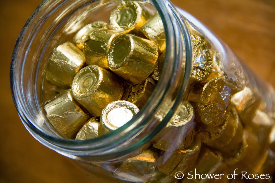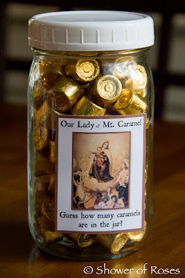 Our Lady of Mount Carmel ::  I opted for individually wrapped Rolo's.  Not only are they filled with caramel, but they are wrapped in gold and look like little crowns, don't you think?  Regular caramels would work great too.