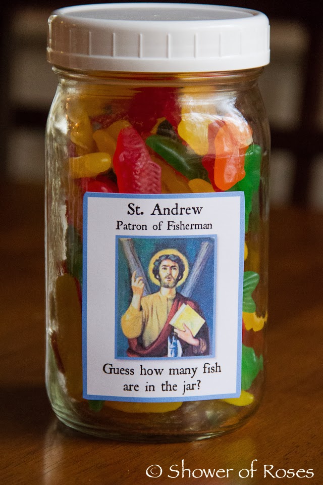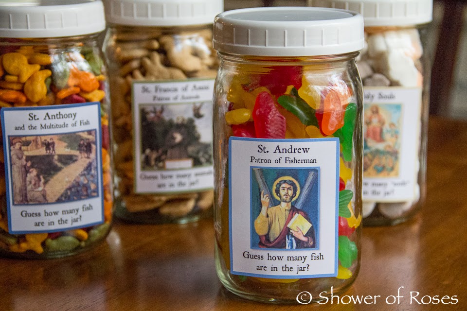 A few days ago I happened to run across the link to some Saint Themed Guessing Jars at Catholic Inspired.  I loved the idea and and was inspired to create a variation for our annual All Hallows' Eve / All Saints' Party which we will be hosting again this week!