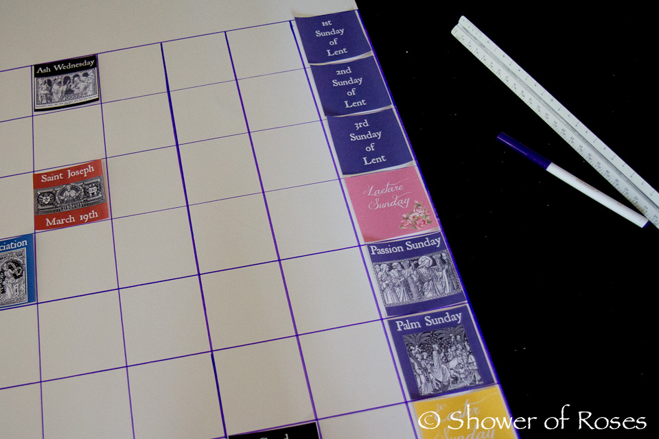Our calendar has a square for each day, from Ash Wednesday to Easter Sunday. Special Feasts and Holy days during that period are decorated to represent that day.  For example, we have a picture of St. Patrick on March 17th and St. Joseph on March 19th.  These special feasts help break up the long Lenten Season.