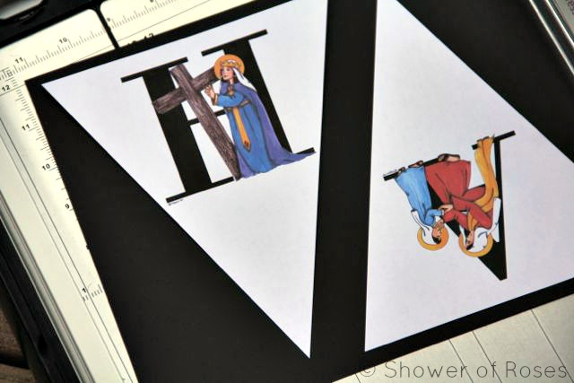 I did call George Nippert, the owner at Catholic Artworks, and was granted his permission to share my document with you all, which includes some of their (copyrighted) Saint Letters resized to the correct size needed for this banner!   (Thank you Catholic Artworks)