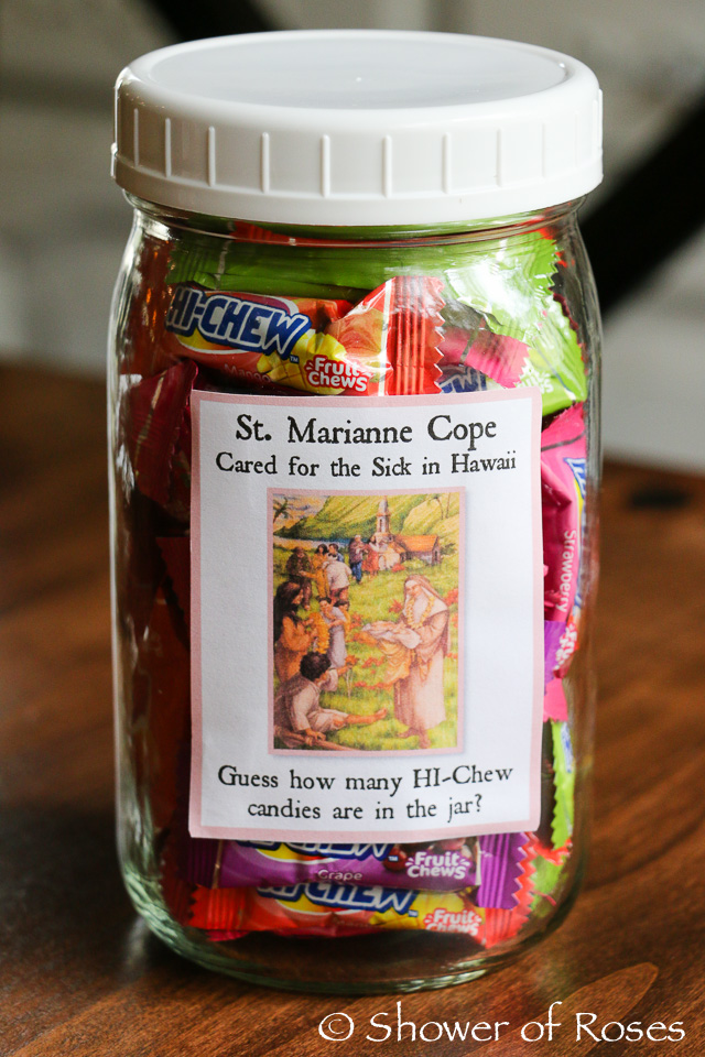 St. Marianne Cope :: HI-Chews are actually a Japanese Candy, but since my family was first introduced to them when my sister brought us some from Hawaii (along with the fact that they have "HI" in the name, the abbreviation for Hawaii) I thought we could get away with using them for St. Marianne Cope, who cared for the sick in Hawaii for 35 years. I bought a big bag at Costco when they were on special for less than $5.00 and only used about 2/3's of the bag. You can also