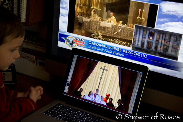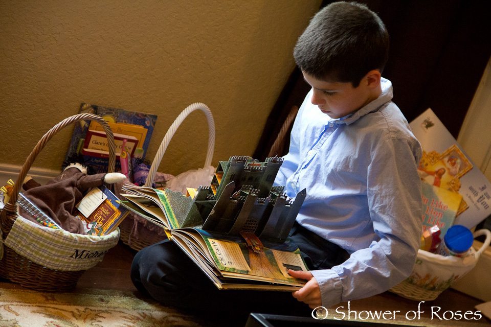 The kids have been having so much fun looking through all the new books they found in their baskets! I meant to post the pictures yesterday, of them looking through their baskets, but I got a little distracted. (I will soon!) Instead I spent most of my own free time planning out our curriculum for next year, making lists of the books we still need, and taking advantage of Adoremus Books Easter Sale to order a few of those books! (However, even I have found time to sneak away and start reading one of the books from my basket!)