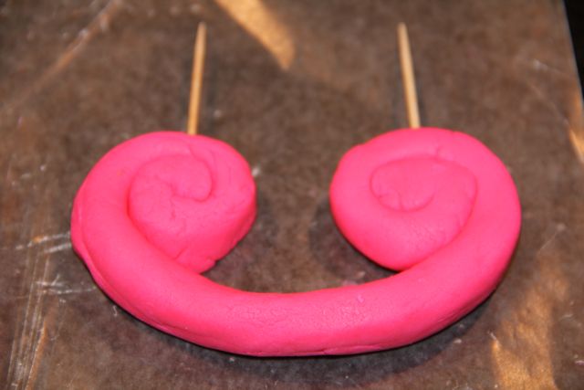 Next I had to figure out how to make a handle and spout...   I almost opted to just make them out of card stock, but since I had a Multi Pack of Neon Colors Fondant (a gift from my mother-in-law), I decided to attempt making them with the neon pink fondant package.   As I stood staring at the cake, trying to figure out how to accomplish this - with one hand on my hip, unconsciously forming a handle - my sister Mary made he laugh as she started singing "I'm a little tea pot, short and stout..."    I love it when my sisters visit!!