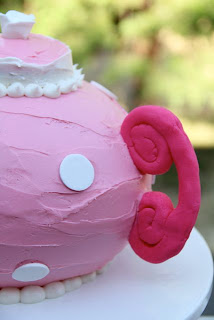 I didn't end up using the fondant roller pictured above.  What I did was break the fondant block in half, rolling half of it into a long roll and then creating a handle by rolling the edges, like a cinnamon roll.   I then made a long rectangle block for the spout, using my finger to create an indentation on the end.   To attach them to the cake I ended up using a combination of wooden skewers and toothpicks.  You can only see one toothpick on each end of the handle, but what I ended up using was a shortened skewer and two toothpicks on each end, sticking them into the cake to secure.   For the spout I molded the rectangle block to the shape of the cake, sticking a wooden skewer through the top of the spout and covering the end with a little dot of extra pink fondant.   Here are a couple more pictures that I took the following morning: