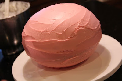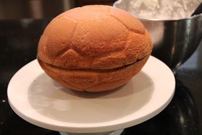 Using the Soccer Ball Cake Pan, I baked the two halves of the cake.   (I actually made the cakes on Saturday, and stuck them in the freezer until Monday when I decorated them.   I usually put the cakes in the freezer for 20 minutes or so before frosting, but frosting this cake completely frozen was the easiest ever.   In fact, I don't think I spent more than 20-30 minutes decorating, from start to finish.)  Each half of the cake is made from one boxed mix.   I followed the directions on the cake pan, and it took about 45 minutes to bake each half of the cake.