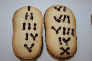 Cover the bottom/flattest side of each cookie with a little bit of cookie icing.    (We used Trader Joe's Triple Gingersnap Cookies.   I had purchased a box of Vanilla Wafers, but they were too rounded on the top and kept tipping over.   Ours were a little too small, but they worked... A slightly larger sugar cookie, that is mostly flat on the top would have been perfect.)