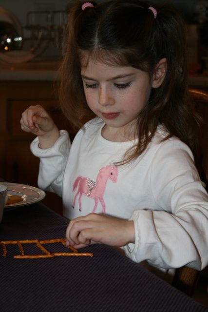 I used string cheese to tie our little bundles of 8 pretzel sticks together.