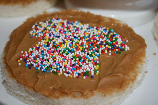 I am making myself take a break from housework, packing, and planning to sit down for a few minutes, so I thought I would share another recipe from the birthday party yesterday.   I found this idea through a google search, and I think it might have originated (at least online) here.  I modified the recipe to be able to use ingredients I already had on hand.  The girls and I had so much fun and they were so fast and easy to make!