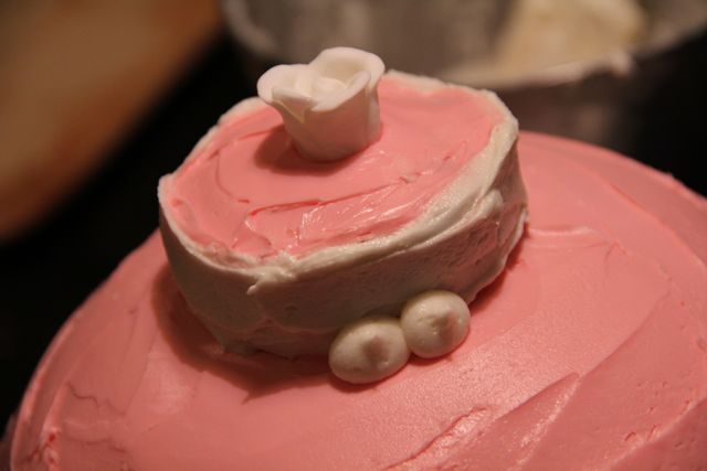 I continued by adding a layer of white buttercream frosting to the center, frosting the top half of the cake, and then adding additional frosting around the center to even it all out.   As you can see, I am awful about getting the frosting all smooth!