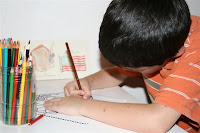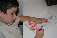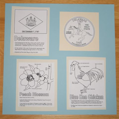 I printed out the worksheets ("4 per Page" from Word -- except for the State Facts which are printed 2 to a page) for Delaware and Pennsylvania, the first two states we will be studying. The boys and I looked to see if there are any special colors for Delaware, and since the official state colors are Colonial Blue and Buff we choose card stock in those colors.
