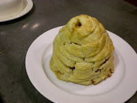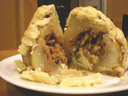 Toast the nuts. Wash and dry the lemon and zest it. Place the honey in a small sauce pan and cook over medium heat until it boils. Add the nuts and stir to coat. Add the zest and salt and spices and cook until the honey is thickly coating the nuts. Wash and dry the pears. Using a melon baller, remove the blossom end and make a small cavity by removing the core of the pears. Spoon the nut mixture in and then plug the bottom with about 2 Tablespoons of cream cheese- depending on the size of your pears. Set aside. Roll your pastry dough out to a rectangle about the height of your pears and 2 x the circumference. Cut into strips about 1/2″ wide. Wrap the pastry around the pear starting from the bottom side and slightly overlapping each go round. Use a little water join pieces as needed. Wrap all the way to the top and place strips on the bottom to cover. Completely encase the pears in the pastry. Bake in a preheated 350F oven for about an hour or until the pastry is golden and the pear is tender when pierced with the tip of a knife. Cool slightly, cut open and serve with vanilla bean ice cream, a caramel sauce or creme anglaise as desired. Serves 2-8 depending on your appetite!