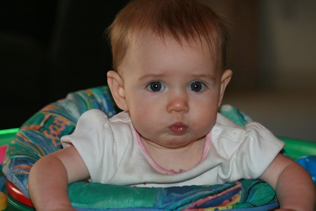 Our little Rose... wasn't sure what to think of her first time in a little swimming pool, but she is already standing up (when leaning against something) and LOVES her little RaZ-berry Teether.