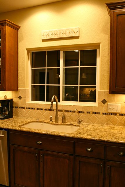 It's hard to believe that we've been using our new kitchen for 3 months already! So far the only things I have near and around our sink are the permanent fixtures, inluding a soap dispenser to match our faucet, and the tile backsplash. I find the simplicity of it all very pretty and enjoyable... something I could never say about our old kitchen sink! :)