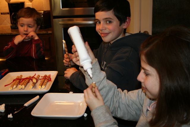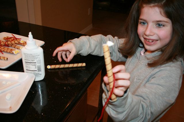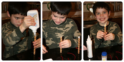 I made a little change to our Edible Candles this year. Instead of using Ginger Thins and Shortbread Cookies, I used just one Nabisco Pinwheel. These worked great as candleholders and I didn't have to worry about securing the "candle" with icing so it wouldn't fall over. :)