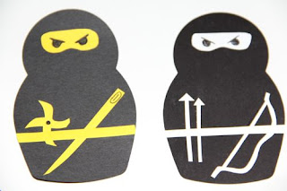 (Font) Cartridges. I also created some of my own paper (with the tiny black nesting dolls, using copyright free images online and printing it in grayscale - my document can be found here) and tied it all together with some red and white gingham ribbon.