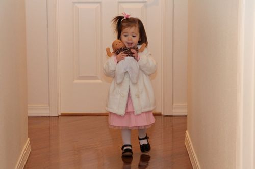 A Sweet New Doll... which Rose HATED! Actually she opened the box and said "Aw! Dolly!" picked up the doll, gave it a kiss, and feeling the different (aka: fabric) skin threw it right back in the box! (I had purchased this doll on clearance over the summer and was thankful I hadn't paid full price. I immediately ordered her another doll