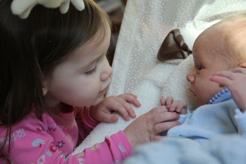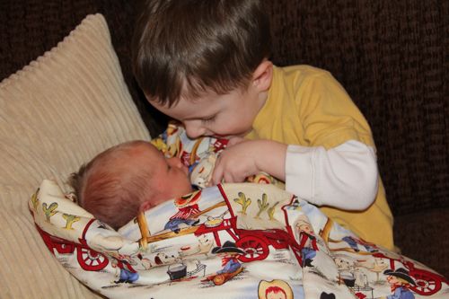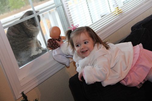 Saying "Good Morning" to the cat, and making sure her doll said "hello" too!