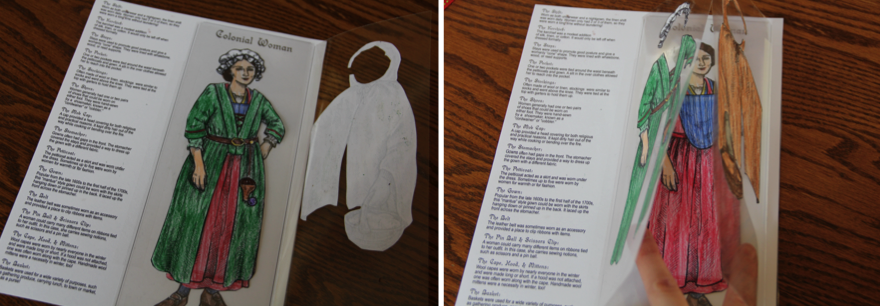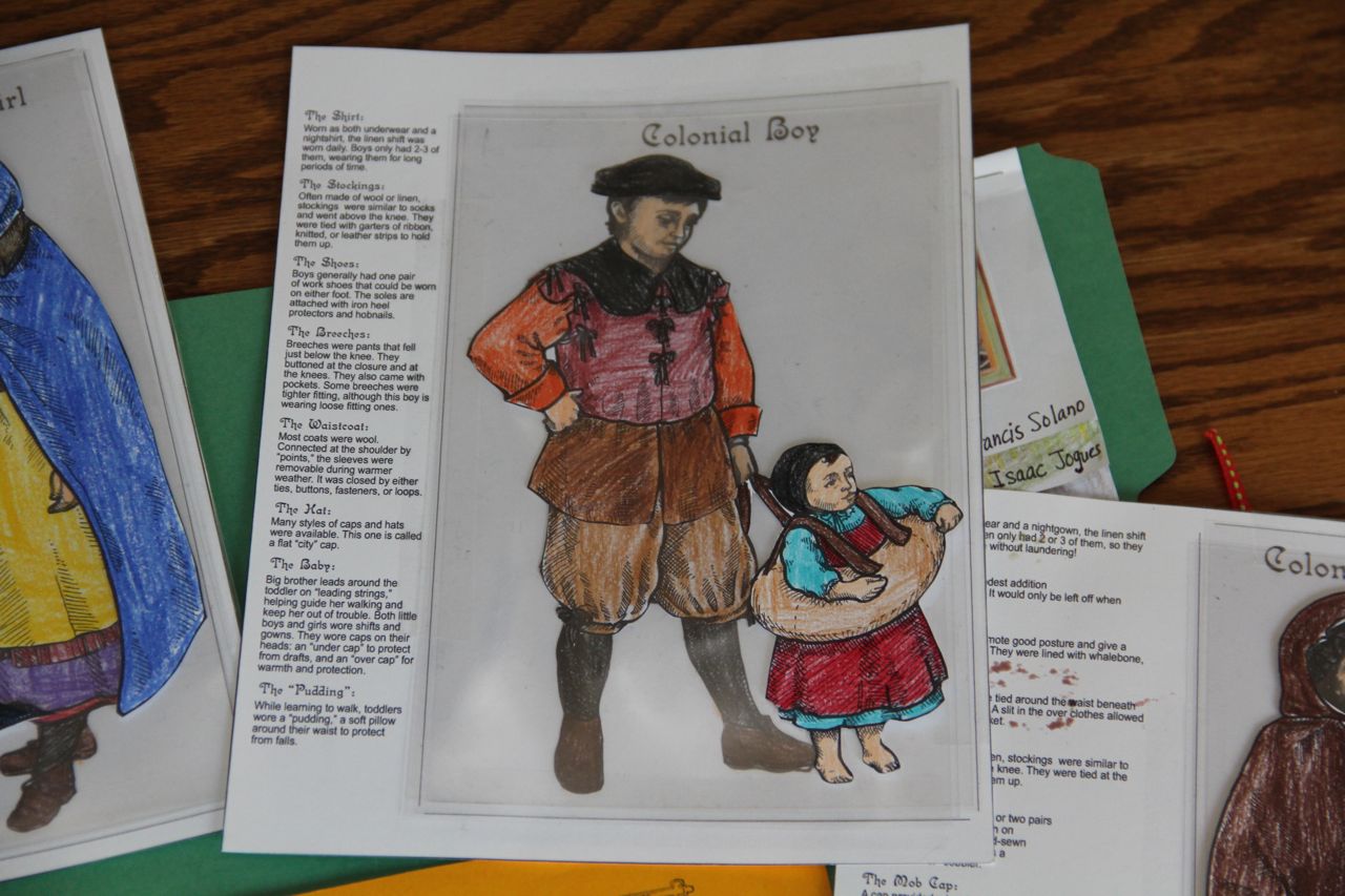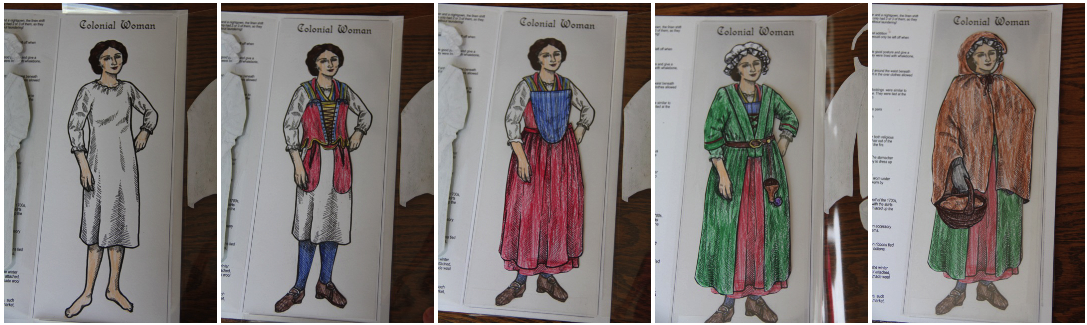 The boys created overlays using transparency paper, and gluing on the different layers of clothing worn by Colonial Men, Women, Boys and Girls.