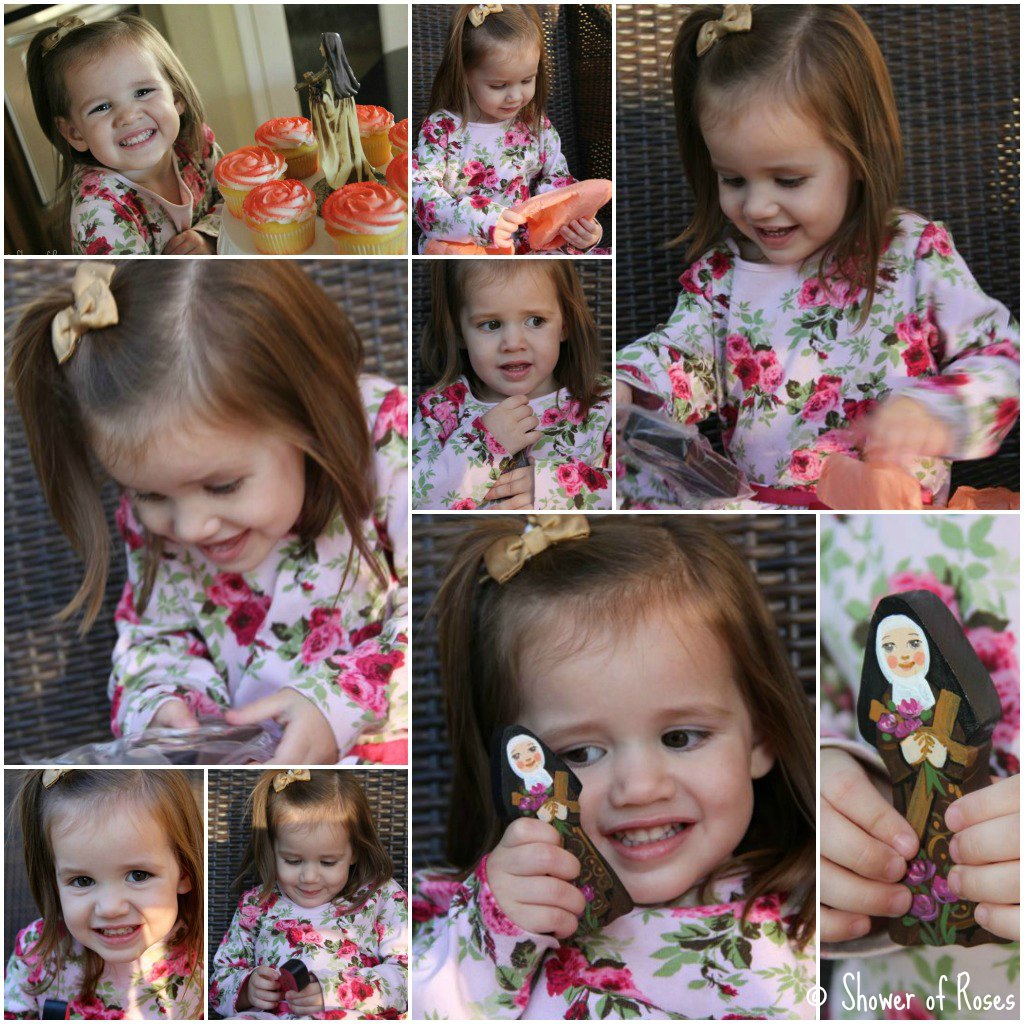 Rose was so cute opening her little Name-day gift... "It's a Saint-uh!" she said, as soon as she was able to peek past the tissue paper.  "It's St. Therese-uh!"  (This cute little Pixie of ours adds "uh" to the end of just about every sentence-uh.)