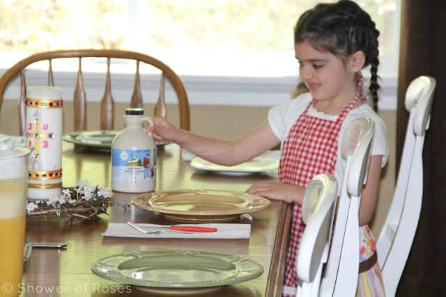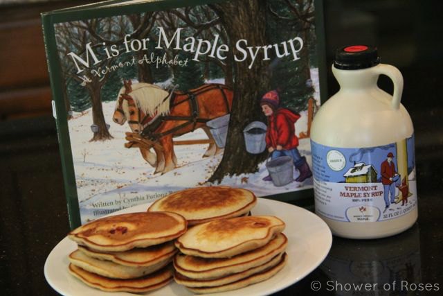 Even though we made "johnnycakes" for Rhode Island, we just had to make more panckes for Vermont!  How could we not, when it meant we could justify ordering some REAL Vermont Maple Syrup?!?   I grew up only eating real maple syrup on our pancakes and apparently I've turned into my mother - carefully guarding that liquid gold and insisting on pouring it for everyone!  For years I would cringe every time I would see my Mrs. Butterworth's lovin' husband pour way too much maple syrup on his own pancakes... He now prefers maple syrup too, and helps (conserve) pour it for the kiddos! ;)