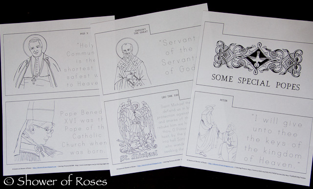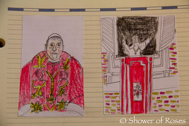 Isn't he great?! Not only is he soft and cuddly (um... can you say that about a priest doll?) - perfect for my little toddler - I love the traditional cassock (over pants) and vestments (including an Alb, Cincture, Maniple, Stole and Chasuble)! Now I can't decide if he is going to end up in Snuggles or Bud's basket this year... And I'm sure Rose would love Sister Marie... But, I did order Hand-painted Bookmarks of their Patron Saints for the 5 oldest, including Snuggles, and plan to complete a set of blocks for Rose (which I still need to get going on), so perhaps he should go to Bud... What do you think?