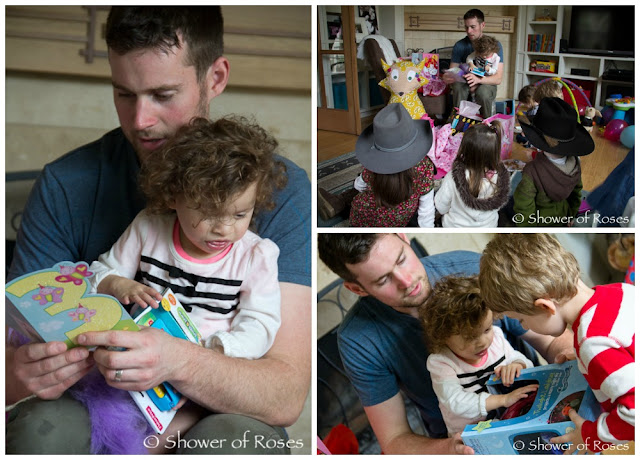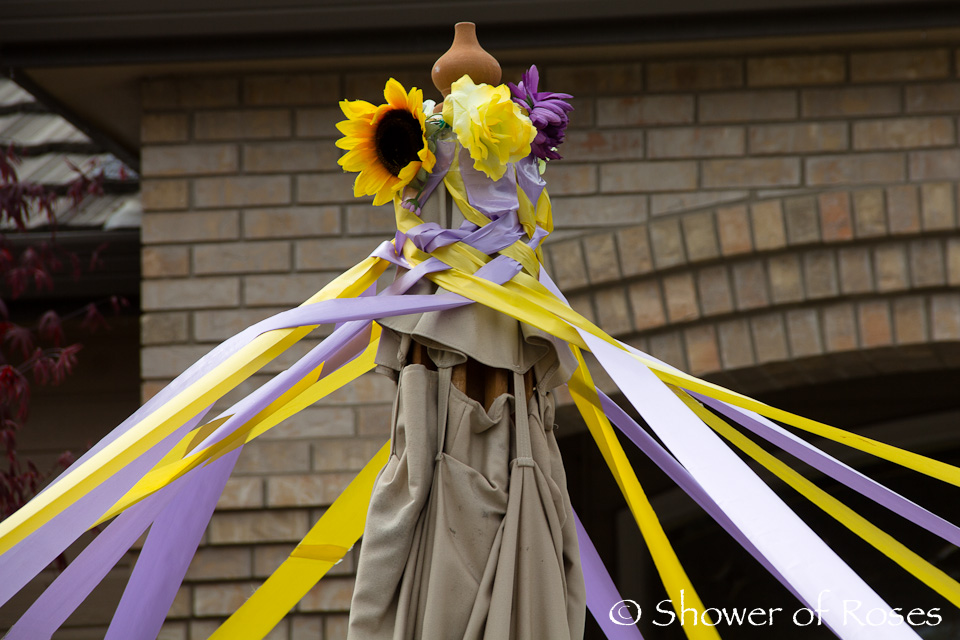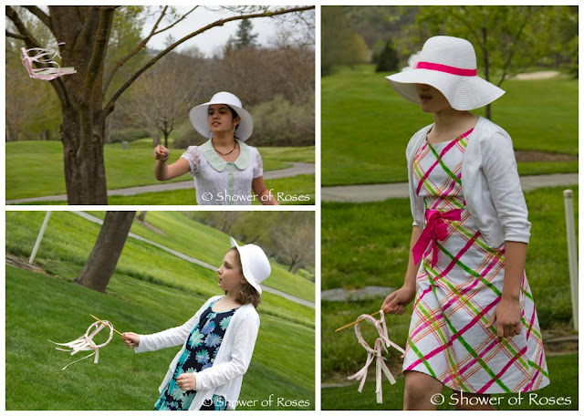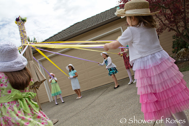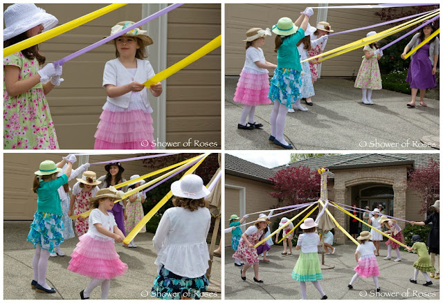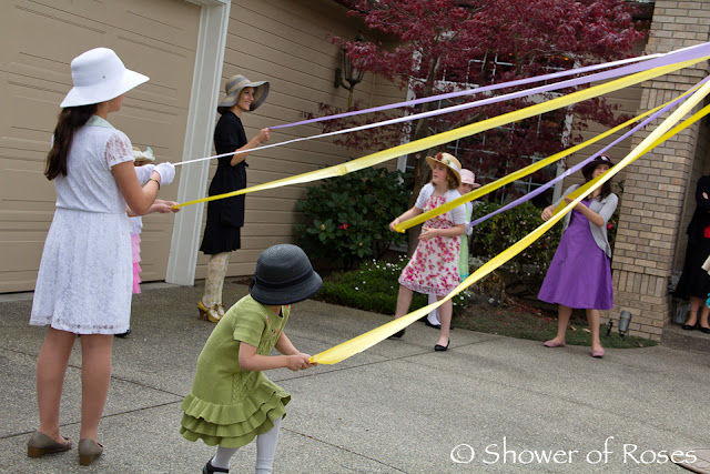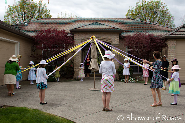 We had 13 girls participating in this year's tea, so she attached 14 ribbons to the "maypole" since an even number of ribbons is needed. (A couple of the moms took turns with the last ribbon.)