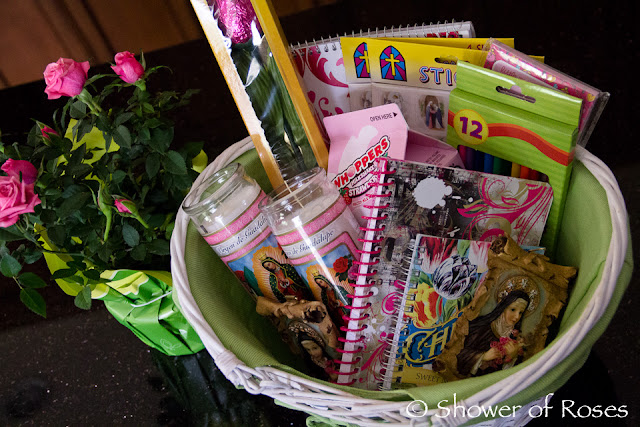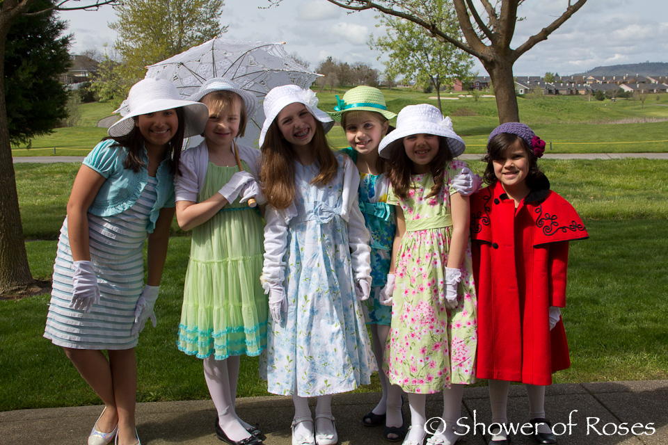 My creative friend, who hosted our tea party this year, made a Maypole with flowers, ribbons, and an umbrella on a stand! How clever is that?! Even though the symbolism of the maypole has been continuously debated for centuries, and no set conclusion has ever been arrived at, Stasia explained to all the girls that she likes to think that all the individual ribbons represent the many different aspects and doctrines of our Catholic Faith, and when weaved together they create something complete and beautiful!
