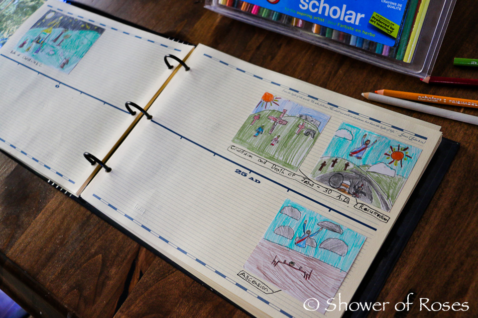 If you flip the page you can see some of the timeline entries he added the last time we studied New Testament and Early Medieval History with Connecting with History. It's always so fun to look through their individual timelines!
