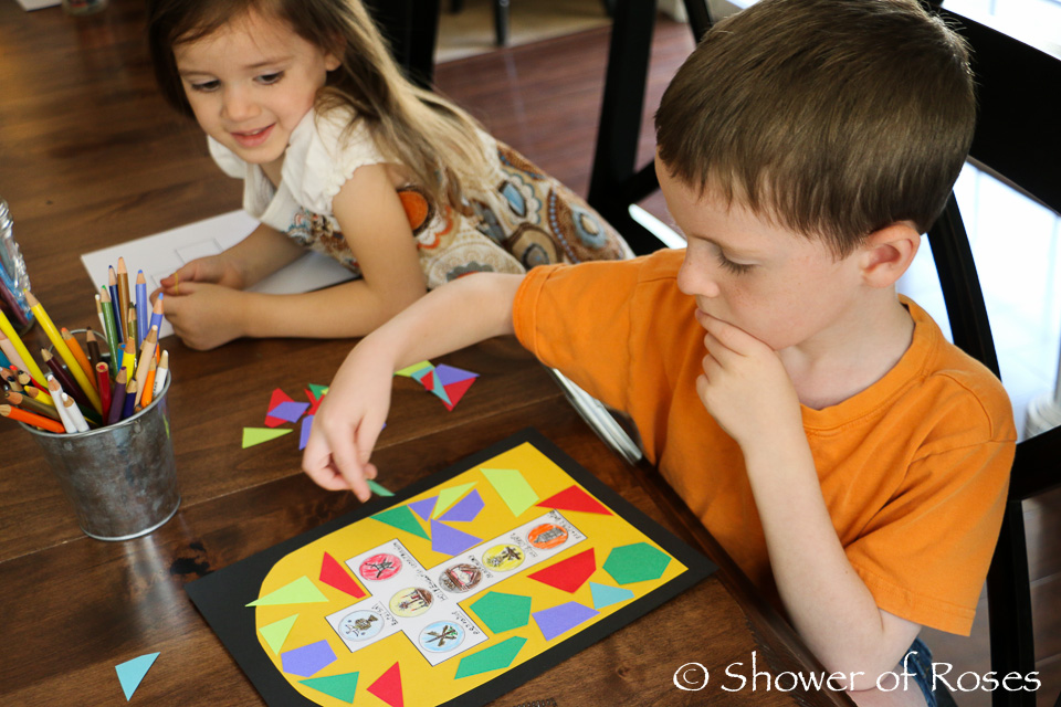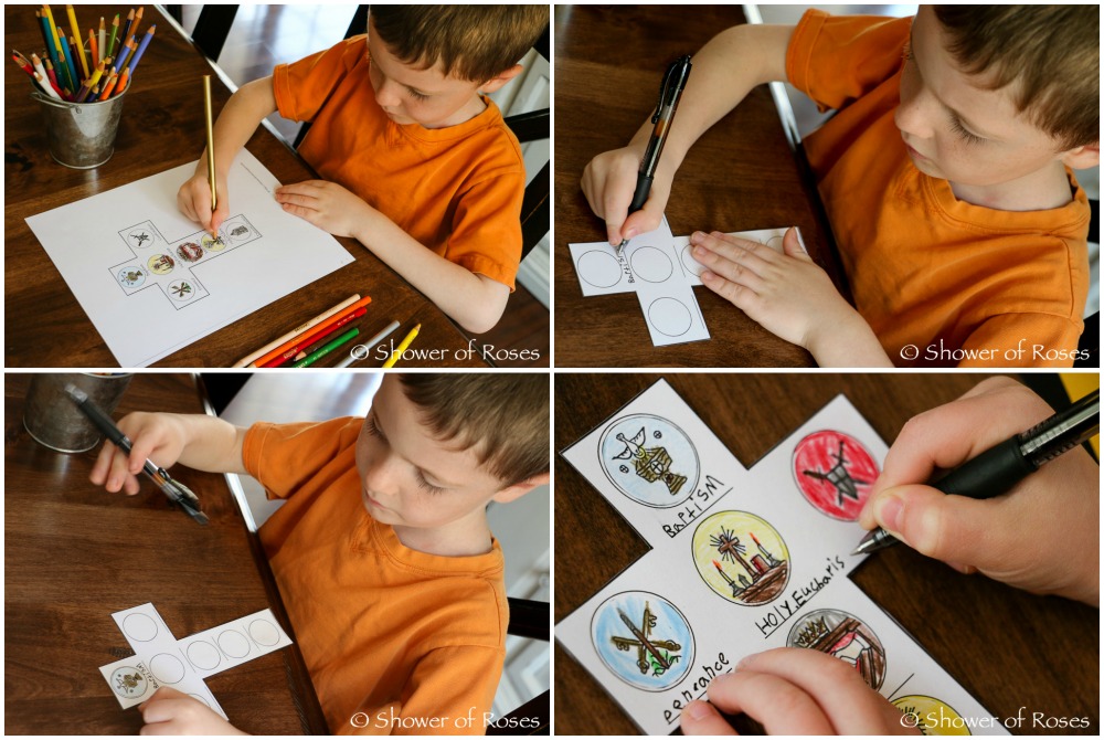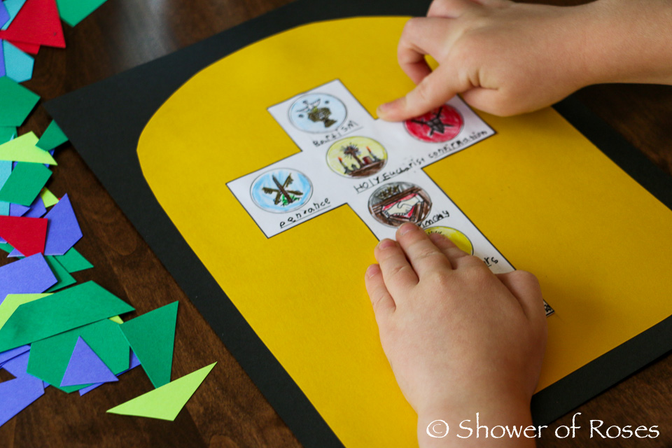 1. Write a list of the Seven Sacraments onto the white cross or color the illustrations if you are using the printable. Another option is to have the children copy a bible or saint quote onto the cross.
