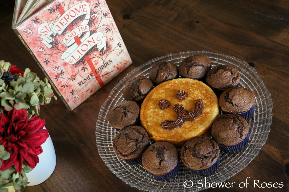 Just like last year, our leftover Michaelmas Cupcakes turned into a lion for today's feast of St. Jerome. The lion's face is a small 6-inch white cake made with some of the batter I whipped up for tomorrow's St. Therese Cupcakes. I ran out of chocolate frosting and didn't have time to make more, but our children didn't seem to mind at all as they enjoyed eating them while I read aloud the story of St. Jerome and the Lion by Rumer Godden from this month's book basket