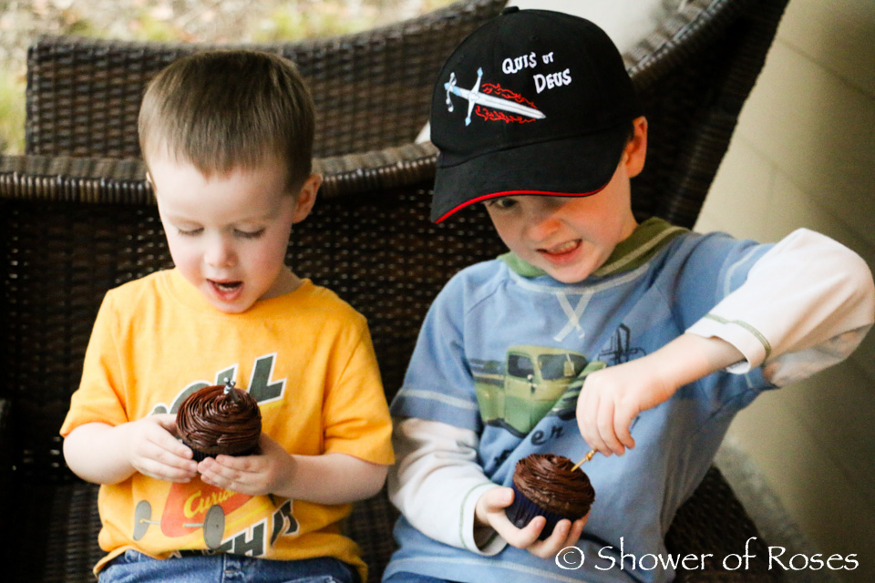 The girls and I arrived home last night from our 10-day road trip and I managed to pull together a simple celebration for today's feast! Devil's Food Cake or Cupcakes (served with toy or cocktail swords to help St. Michael defeat the "devil") have been one of our family traditions on this feast for years and I couldn't let the day slip by without making them for dessert. I also had a new "Quis ut Deus"cap for Snuggles, read aloud the story of St. Michael from Heroes of God: Saints for Boys (also available here), and we all listened to The Day the Angles Fell from Regina Martyrum Productions! We had a great time on our trip, and I'll share about it soon, but it is so nice to be home again!
