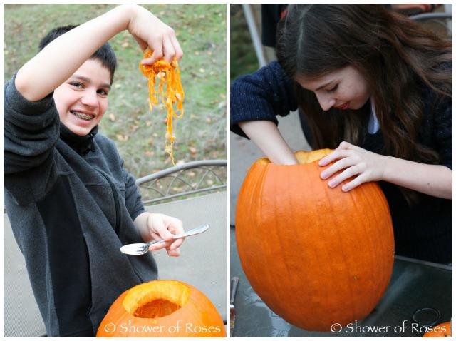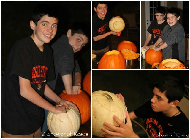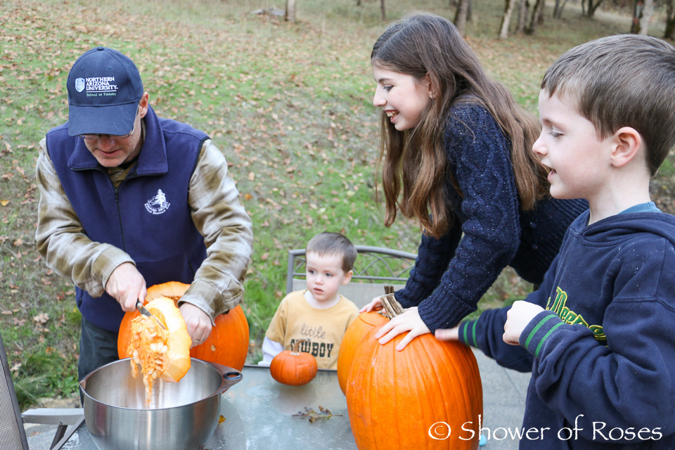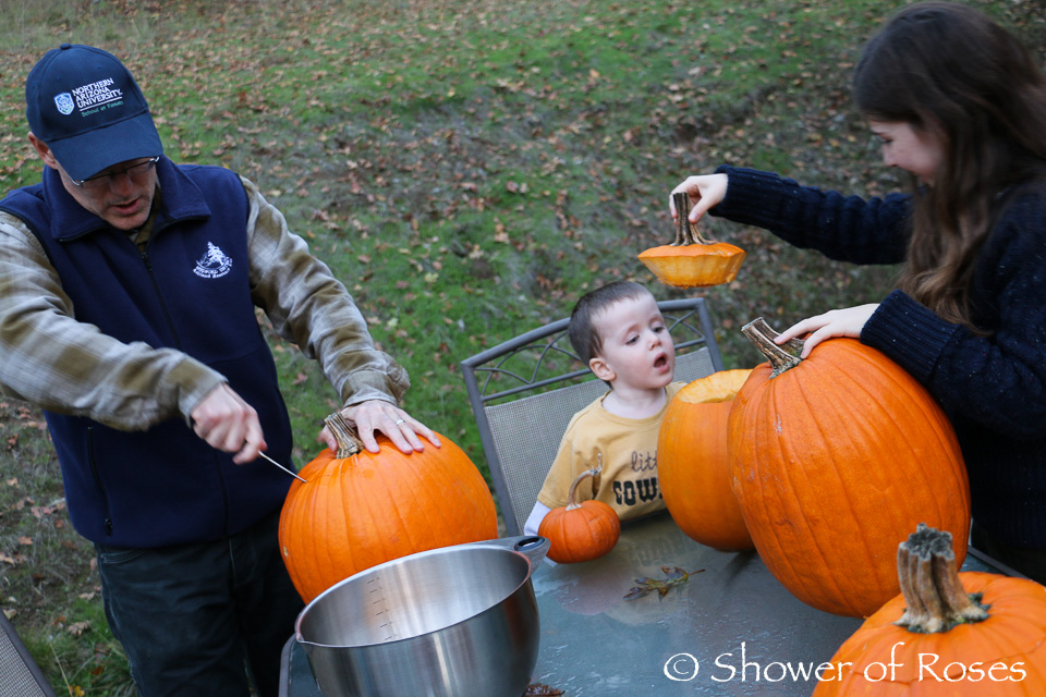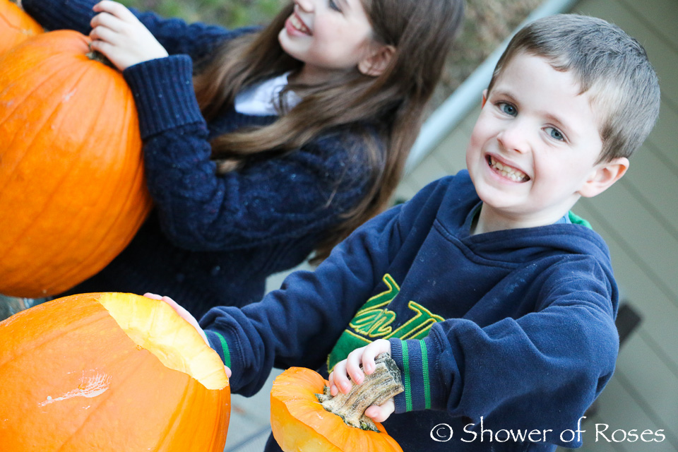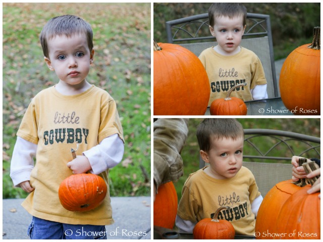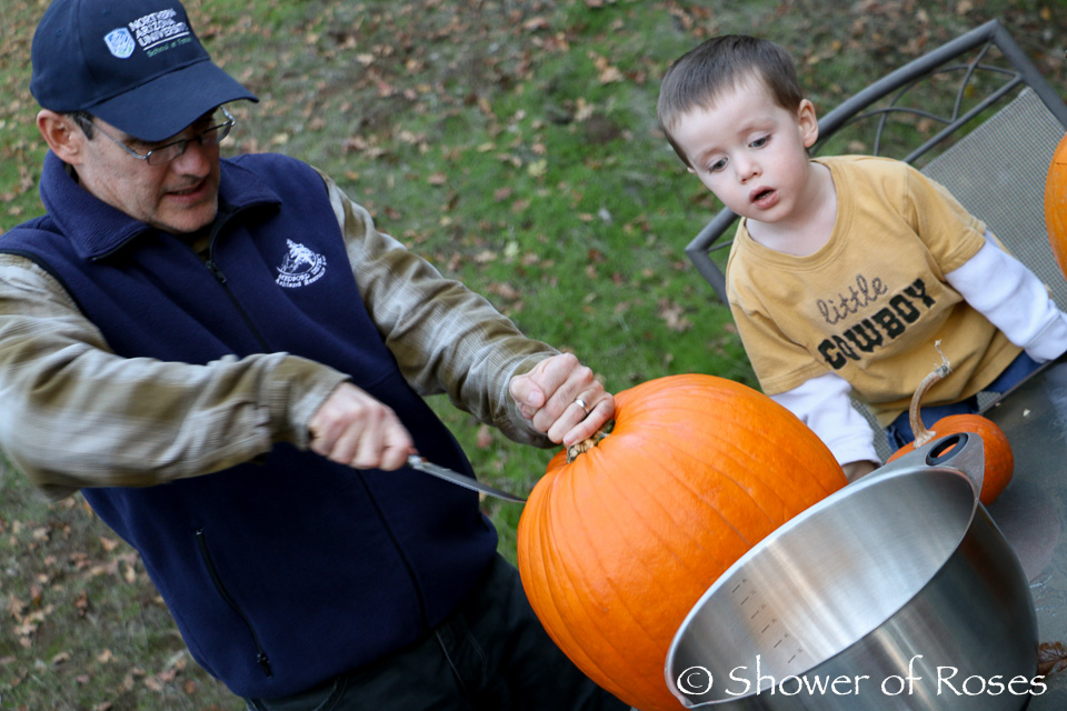 Poor Captain… The pumpkin he choose at our parish fundraiser last Sunday was completely rotten inside. He tried to salvage it, until I just couldn't take the smell any longer and insisted it go straight to the compost pile… far, far away from the house. It smelled SO bad!