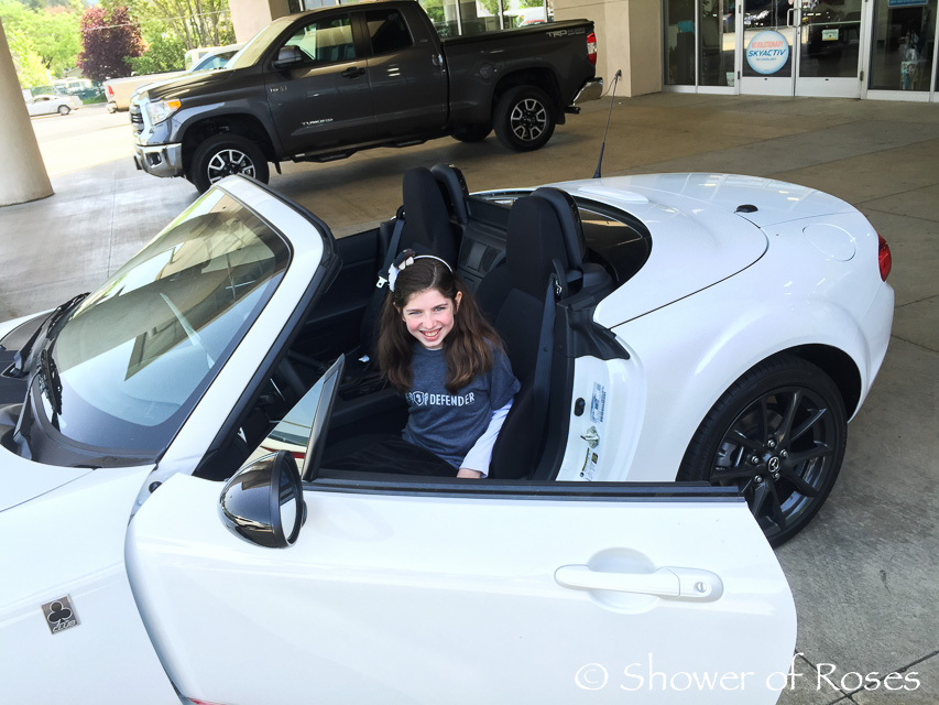 "I loved participating in this contest! I especially loved holding all the baby animals, holding my baby cousin, and learning about my great-grandma who was arrested and sentenced to jail just before she died for praying in front of an abortion clinic. I wish I could have met her! I also really loved sitting in the driver's seat of that brand new white Miata!" ~ Twinkle Toes