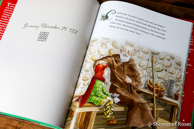"It's Christmas Eve 722, and Kristoph, a young orphan boy, is accompanying the missionary priest Boniface through the German countryside. They are hurrying to reach the next village by nightfall when they come upon a group of people in the forest worshiping an oak tree and preparing to sacrifice the son of the village chieftain. To prove that the oak is powerless and that there is only One True God, Boniface miraculously fells the giant tree with a single ax stroke. In its place stands an evergreen. Calling it "the tree of the Christ Child," he instructs the men to mend their lives and take the tree home where it will shelter "loving gifts and lights of kindness." Now rescued, the son of the village chieftain invites Boniface and Kristoph to share Christmas with his family ...around another evergreen that Kristoph cuts down for their own celebration."