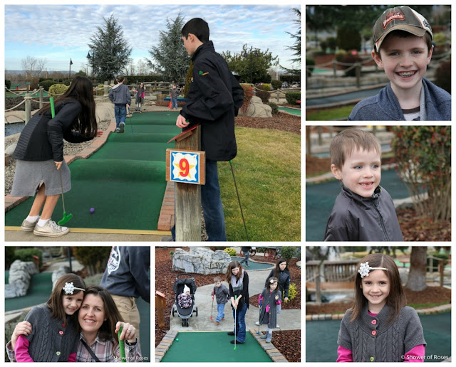 I joked that I wanted to go sledding so the kids could take a picture of me coming down the hill while they hold a sign that says "over the hill and picking up speed!" ;) It's been a very mild winter here though and we hadn't had any snow within driving distance. The ski resort hasn't even been able to open yet due to lack of snow... (We actually woke up to a light layer of snow this morning! It was slushy and has already melted but the kids were so excited.) Instead we ended up taking the kids miniature golfing and had the whole golf course to ourselves!
