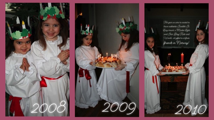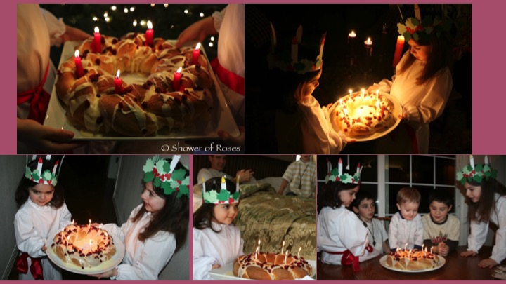 Traditionally ‘Lussekatter’, St. Lucia's Day Buns flavored with saffron and dotted with raisins, are served by a girl dressed in a white dress with a red sash around her waist and a crown of candles on her head.